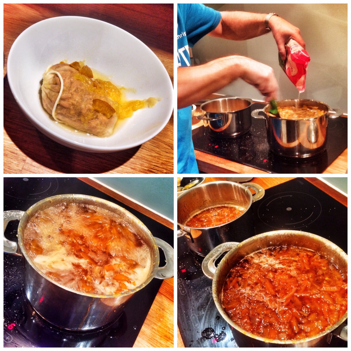 3) Squeeze all the juice from the oranges and lemons into the bowl, but catching the pips and keeping them to one side. I found my ‘Joseph Joseph’ hand juicer balanced over a sieve, over the bowl, made this fairly fiddly task go by with minimum fuss. (I’m afraid the kitchen diaries took a bit of a dousing with squeezed orange at this point!). Chop the pulp up and put that in with the juice.