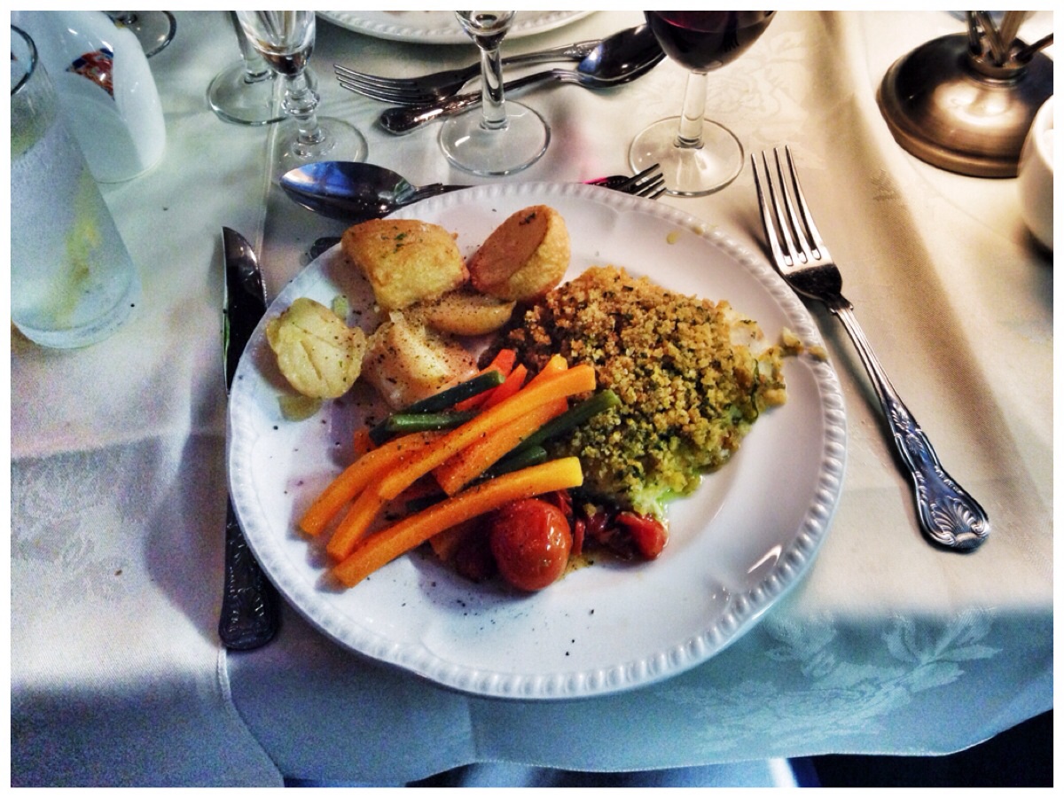 The more experienced waiting operatives shimmered in and out from service like an expectant Jeeves whilst the young helpers fluttered around. The service was all rather pleasant. Young and old alike providing the food and unscrewing the wine top. The mains were up next. The hot plate presented first with a piping hot, herb crusted cod. A decent wedge too. The young flutterers lined up to add the basic veg of carrots and green beans along with Lyonnais potatoes and roast potatoes. I think we managed to acquire a fairly exclusive romesco sauce to add piquancy and moisture. Considering the obvious kitchen constraints the food was presented very well and arrived piping hot. It was tasty too. A further rest on Ramsbottom station afforded the neat idea that we were truly living in the vintage past. Some old cases were piled up on the platform.