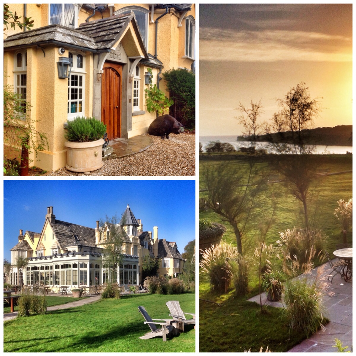 We floated across to Studland from Poole and wound our way down a narrow track. She homed into view. The Pig in all her glory (it must be a she mustn’t it?) A riot of yellow, cream, straw topped turrets amidst a sea of foliage. We crunched our steed into the packed car park (past the rather fetching bronze Pig, guarding the door). It only has twenty three rooms but it seemed the whole of Dorset was in town! Despite being a Monday lunchtime, the place was packed. Diners crammed the restaurant whilst the post lunch crowd slept off their feed in the elegant lounges. As our room was only ready at three we tootled down to the ‘Bankes Arms’ and swooped in a Purbeck IPA (brewed on the premises) for starters. The four day break was starting nicely.