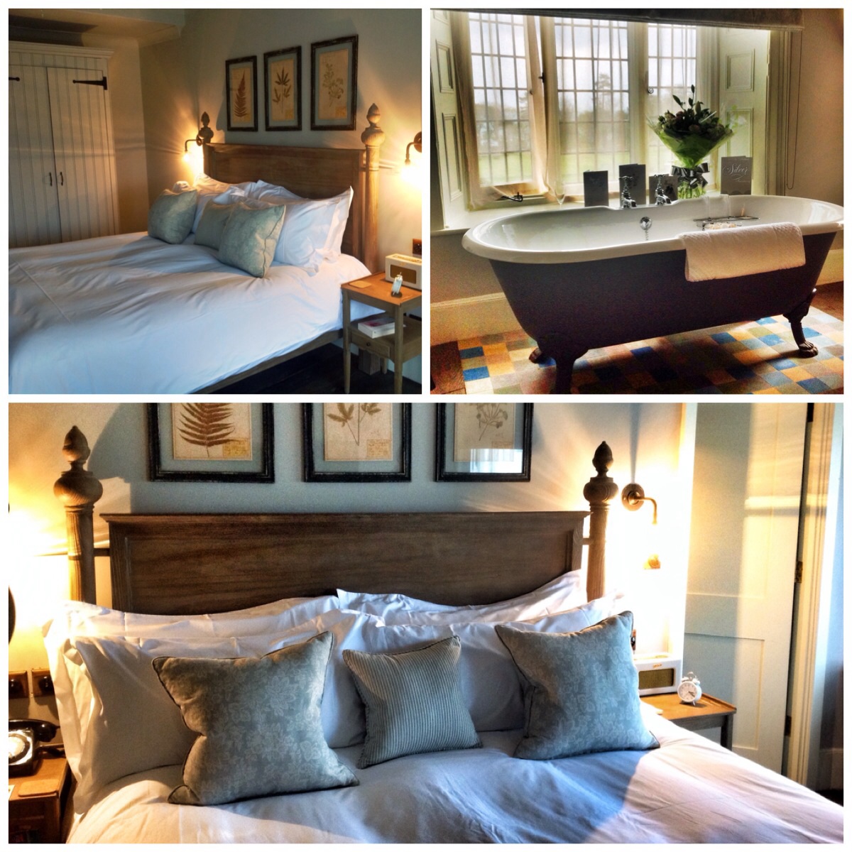 We gleefully romped up the winding steps to our No 11 room. It overlooked the grounds and the Middle Beach of Studland bay, ‘Harrys Rock’ to the right, the fleet of happy, laying hens to the left. Set in the bay window was our very own roll topped bath. The room was elegance and charm personified. Greys, creams, wood and bakerlite completed the rustic, vintage theme.