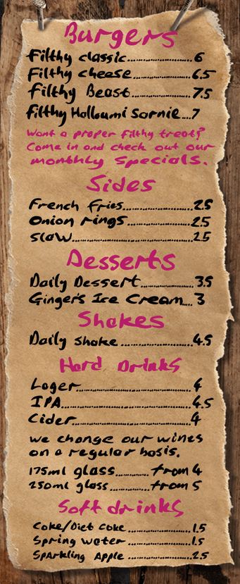Bit of a masterstroke getting local ice heroes Ginger to stump up the ice cream for the shakes. Bit steep at £4.50 but boy it was good. Glorious, creamy filler for the main event. After a few minutes our flashing alert disc sprang into action. The filthy beasts duly arrived. They were sheathed in their own ‘izal’ bog paper wrap, each topped with their own ‘filthy’ badge. Once unravelled we both marvelled at the spectacle. Moist, pink patty, crisp lettuce, crispy bacon and lashings of cheese. No question it was a great burger. I would say as good as I’ve had at other famous establishments in the city. We wolfed the hot salty chips and wiped ourselves down with the branded napkins. We left some twenty minutes later very happy indeed.