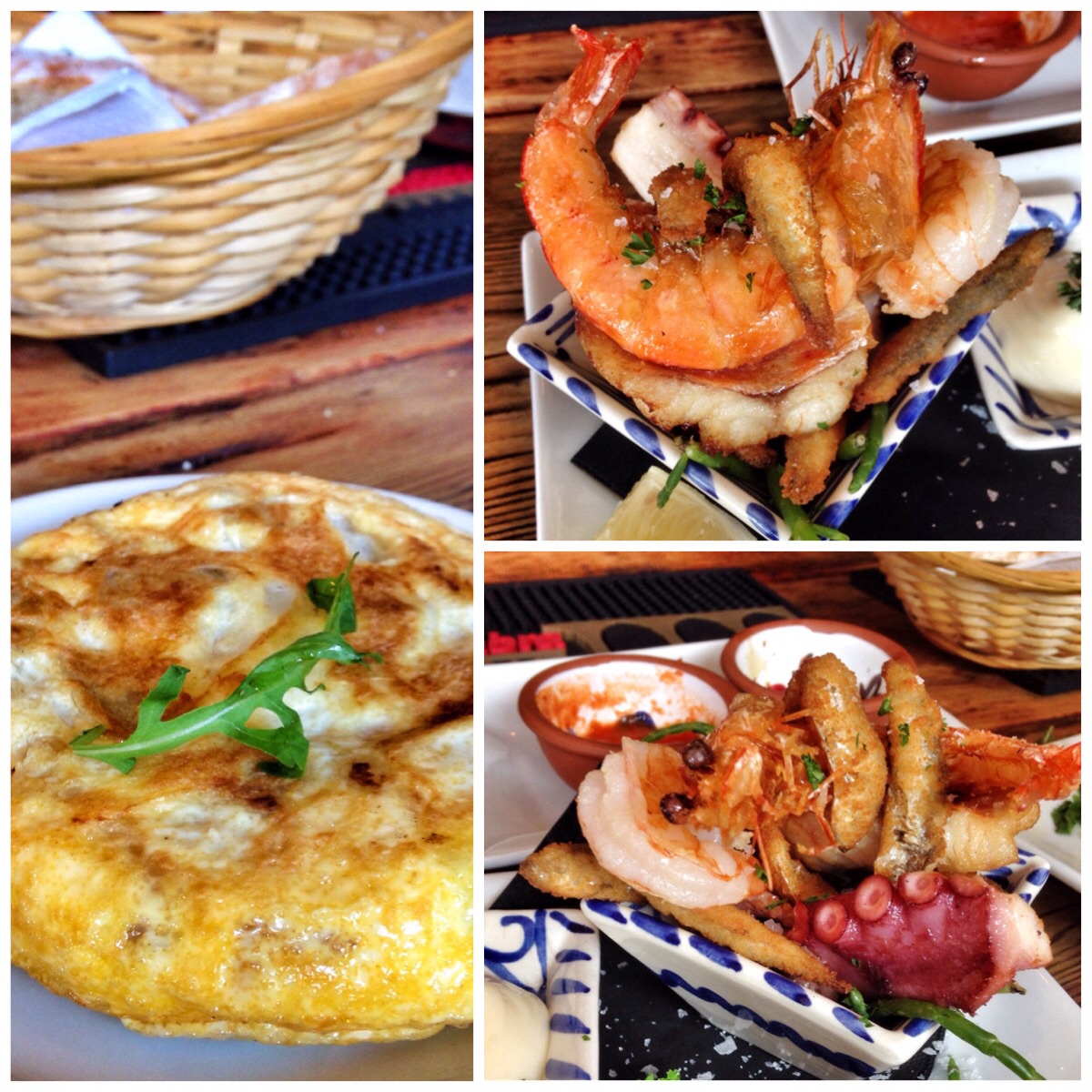 We started our review of the extensive red and yellow menu. A bottle of Moritz, a Barcelona brew, was used to quench the initial thirst. Our table was a little isolated and given the air con setting a little cool. A nearby representative adjusted things so that we could remove our coats! Once settled we made our choice of three tapas each.